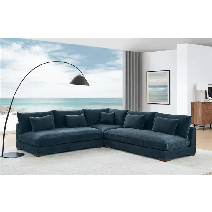 Bring modern comfort and effortless style to your living space with this modular sectional. Designed for both relaxation and versatility, it combines a plush, oversized feel with a clean contemporary look. Features: Built with a durable engineered wood frame and solid wood block feet in a rich brown finish. Upholstered in soft, textured corduroy fabric with a neutral tone that complements any décor. Cushions are filled with high-density foam and supported by coil springs to maintain shape and comfort over time. Oversized deep seats provide extra room to stretch out and relax.